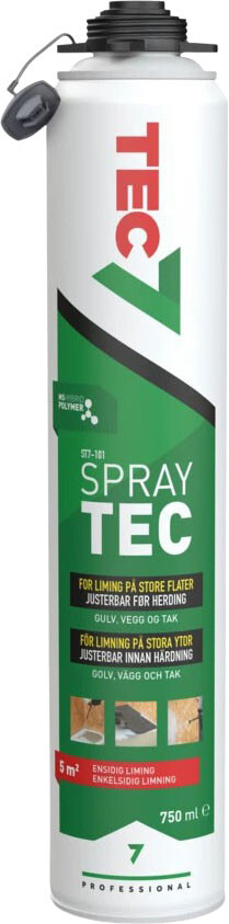 Tec7 Spraytec ST7-101 er et helt unikt MS Polymerlim. Spraytec sprayes på overflaten med påføringspistolen Tec7 Spray & Pur Gun. Dette gir den store fordelen at limet fordeles jevnt over et større område. Dette er spesielt ideelt ved liming av gulv- eller takbelegg. Den hefter til de fleste materialer, også XPS og isopor, selv på fuktig overflater.Spraytec er svært tidsbesparende sammenlignet med tradisjonelle gulv- og kontaktlim. Det er i motsetning til kontaktlim kun nødvendig å påføre lim på én side, som betyr at forbruk halveres. Det er mulig å justere materialene etter montering i opptil 30 minutter, noe som også skiller seg fra andre lim og tape. Ved å tilpasse mengde lim som påføres, justeres også limstyrken. Et tynt lag gir et feste som er letter å fjerne, som f.eks. bytte av teppefliser.