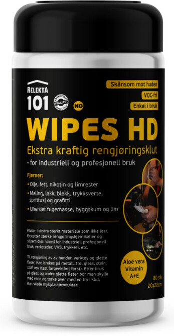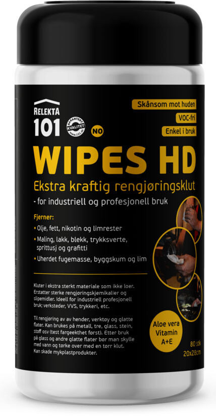 Relekta 101 Wipes HD brukes for å rengjøre overflater og verktøy for olje, fett, løsemidler, fastgrodd møkk, o.l. De er godt egnet på steder hvor det foregår mekanisk arbeid, som i verksteder, båtopplag, verft, o.l. Siden dukene holder seg fuktige i mange timer, passer de godt for dem som ikke bruker opp hele duken med en gang.Klutene tåler tøff behandling uten å revne, og løser opp fastgrodd møkk på de fleste overflater. Den lagvise oppbygningen gjør at de absorberer 6 ganger sin egen vekt, og er særlig effektive mot olje og fett. Såpen i duken senker overflatespenningen på olje og fett slik at de absorberes godt inn i duken og blir værende der ved videre bruk.