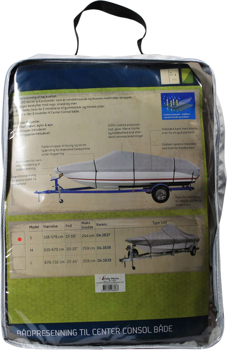 Formsydd presenning av høy kvalitet som beskytter mot regn, sol og smuss. Produsert i vannavvisende grå 300 denier polyester slik at den er robust og tåler nordisk klima. Elastiske stropper er sydd inn for å gi best mulig passform. Finnes i tre forskjellige størrelser til styrekonsollbåter.- Forsterket i utsatte soner