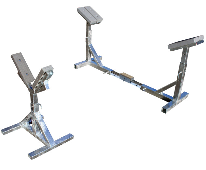 Justerbar båtkrybbe i varmgalvanisert stål. Kan justeres i høyde og bredde. Grå gummipute. Konstruert for flere kjølkonstruksjoner. Byggesett som lett kan transporteres i personbil og tar liten plass ved lagring.