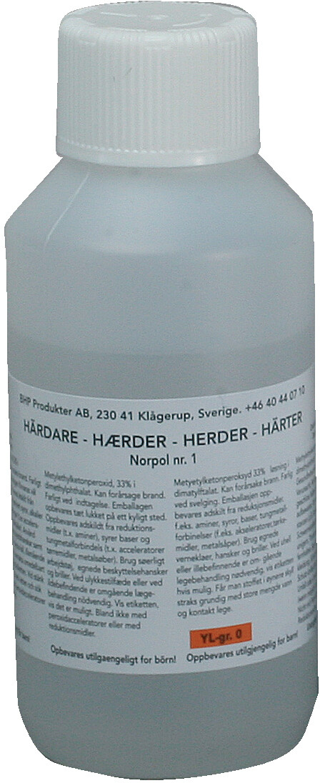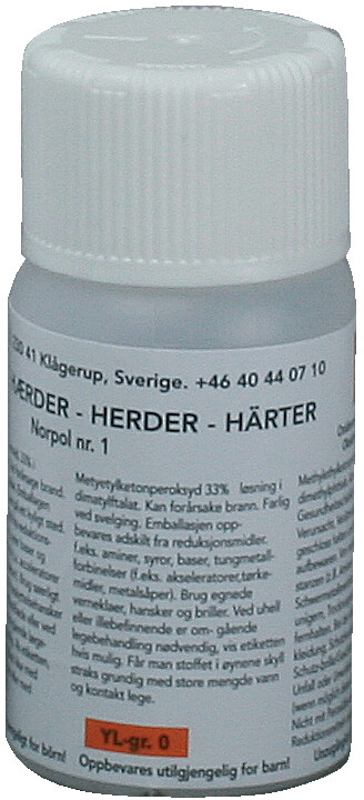 Herder for polyester, vinylester, gelcoat og topcoat. tilsett 1-2% avhengig av arbeidstemperatur.