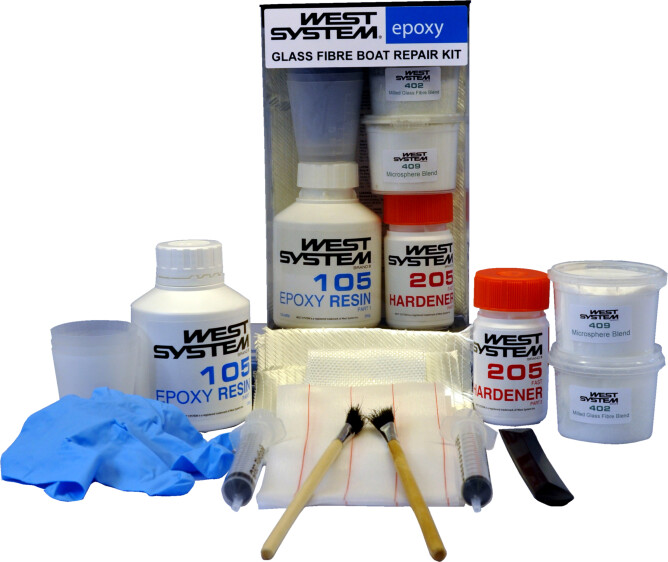 Denne pakken inneholder alt du trenger for å reparere/utbedre skader på glassfiberbåten din.