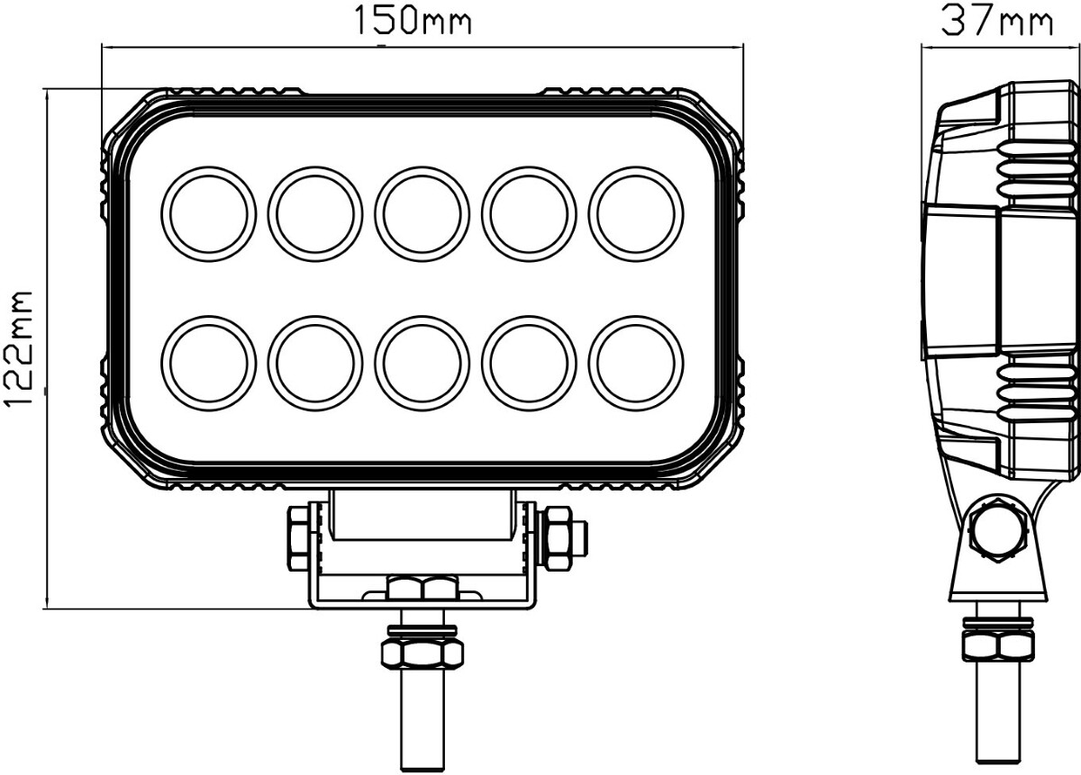 Kraftig spot arbeidslys fra 1852 med brakett i rustfritt stål, hus i aluminium og linse i polykarbonat.