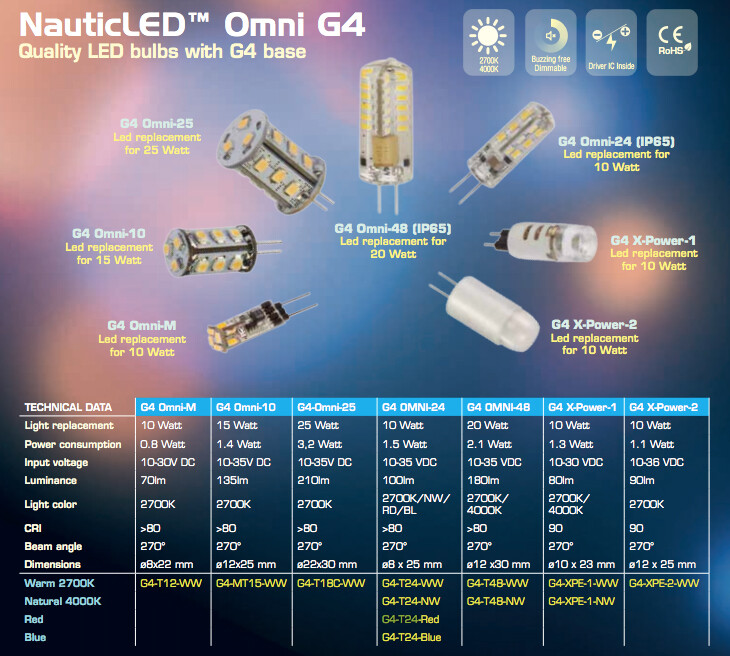 LED innsats som erstatter G4 halogenpærer. Høy kvalitet. Høy lyseffekt. Multivolt 10-35V. Kompakt og rundtlysende utførelse som gjør seg nytte av reflektoren i lampa.
