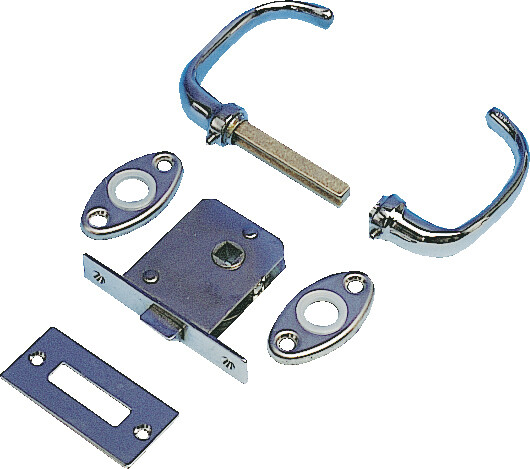 Låsen består av låsekasse, to ovale dørskilt og vrider. Kan ikke låses.