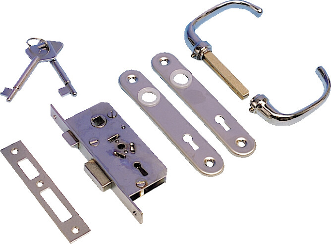 Låsen består av låsekasse med to nøkler, to dørskilt og vrider.
