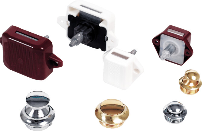 Praktisk og meget dekorativ skaplås. Låsen åpnes ved å trykke på knotten. Trykknappens dybde (13/16/19 mm) bestemmer tykkelsen på skottet. Leveres komplett med trykknapp i messing/krom og brun eller hvit låsekasse.