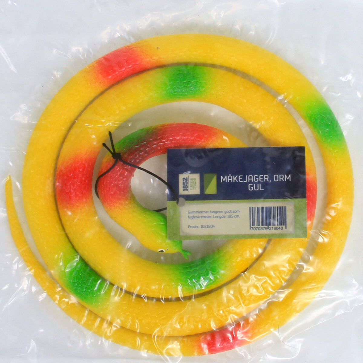 Gule gummiormer fungerer godt som fugleskremsler. De krever ingen montering, og kan legges akkurat der du måtte ønske. Ormen får ekstra god effekt får om du lar den ligge eller henge slik at det er litt bevegelse i den. Du kan også legge ut flere ormer rundt hele båten.Du skal ikke se bort fra at denne også kan skremme bort en og annen innbruddstyv...