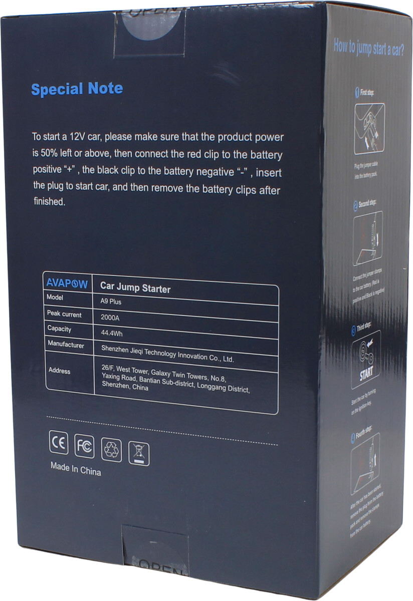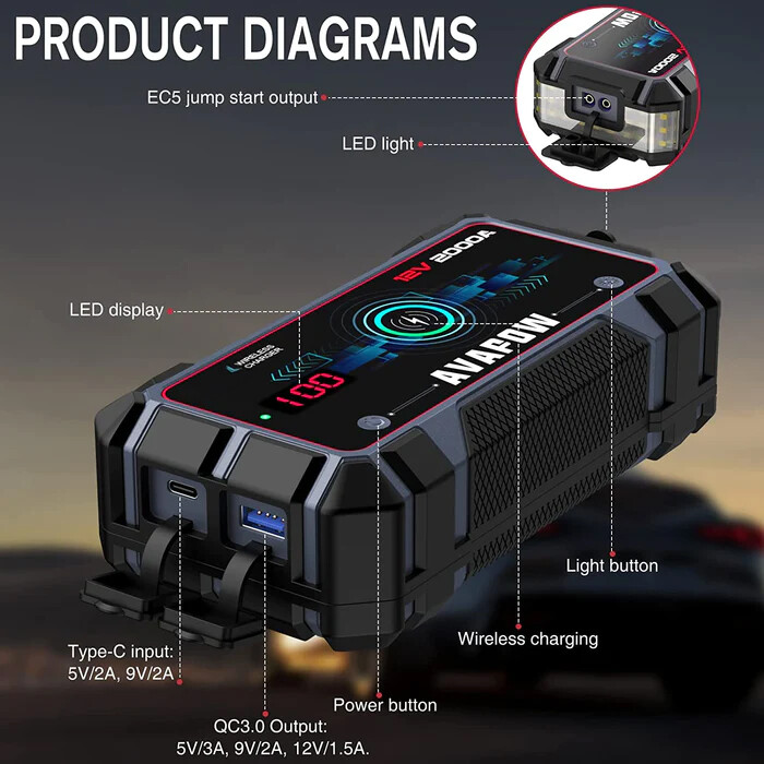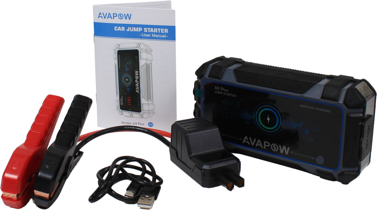 Svært kraftfull og samtidig kompakt jumpstarter for alle biler, båter, ATV osv. med 12V startbatteri. Startboosteren er kraftig nok til å starte opptil 8-liters bensinmotorer og 6,5-liters dieselmotorer. Innebygde sikkerhetssystemer hindrer gnister ved eventuelle feilkoblinger.I tillegg til å starte motorer, kan Avapow Jump Starter A9 Plus brukes som batteribank til å lade for eksempel mobiltelefoner. I tillegg til USB-uttak har den trådløs lader for mobiltelefoner. Bare legg mobilen oppå startboosteren, så lades telefonen. Den har også en kraftig lykt på 400 lumen med mulighet for blinking i SOS lyskarakter.