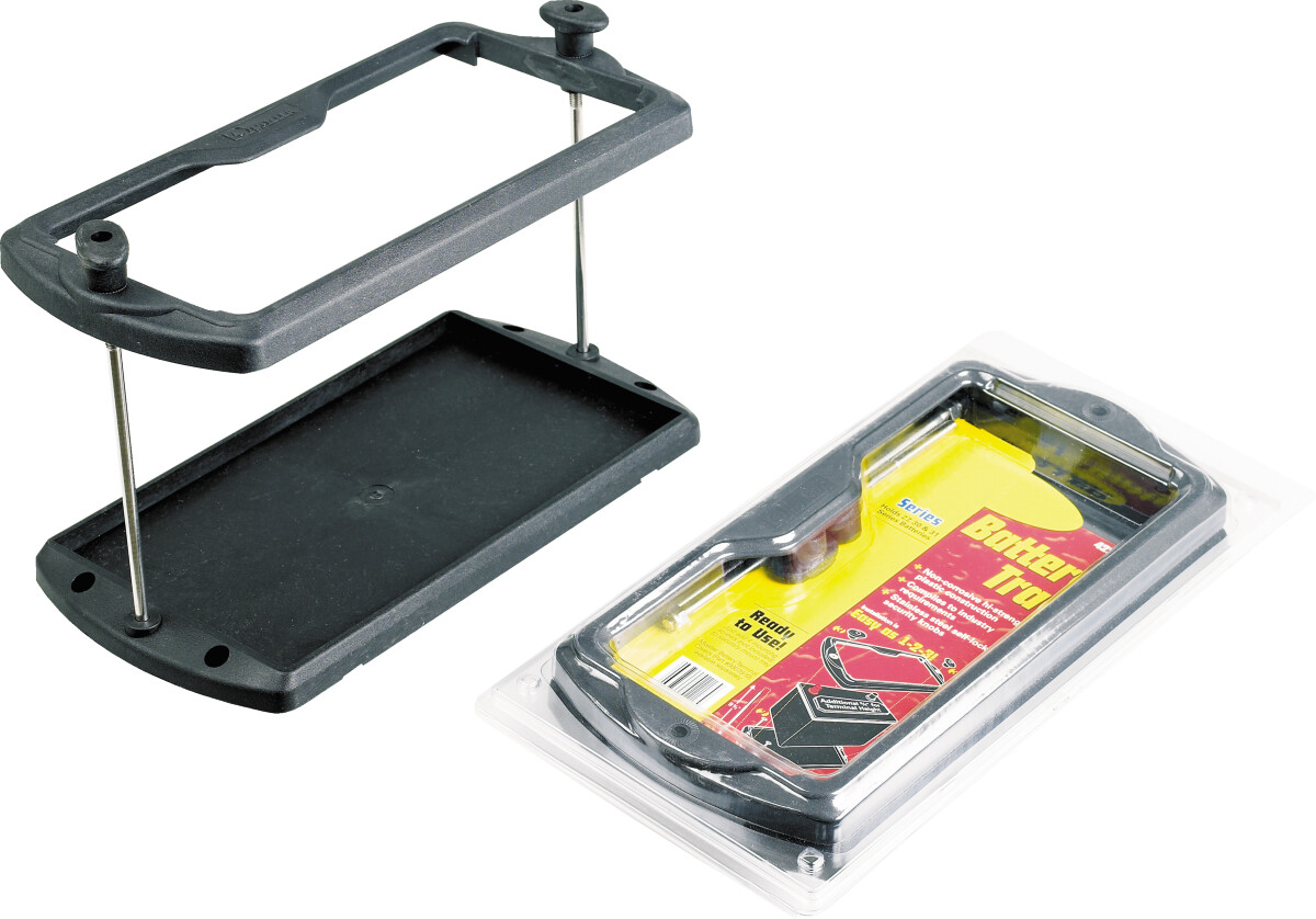 Solid holder for start- og forbruksbatteri. Produsert i kraftig spesialplast med meget høy styrke. Hel bunnplate for fastmontering. Rustfrie bolter med store vingemuttere i toppen for enkelt å kunne åpne og låse batteriet fast.