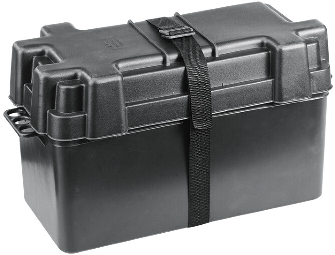 Batterikasse i polypropylen, som passer til de fleste batterier opptil 120 Ah. Boksen kan romme batterier med lengde opptil 385 mm, men leveres med flyttbar skillevegg slik at også mindre batterier vil stå stabilt. Den leveres også med stropp og skrufester for å feste stroppen til underlaget.