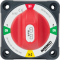 Batterivelger fra BEP. Den har en kapasitet på 400 A konstant, 600 A i opptil 5 min og 1500 A i 10 sekunder. Velgeren monteres utenpåliggende. Den kan vendes til av, kun 1, kun 2 eller begge batterier.