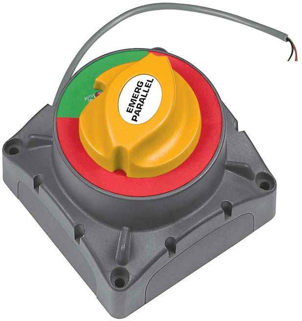 Motorisert parallellkobling av start og forbruksbatteri m/innebygget "Dual Sense" ladestrømsfordeler. Parallellkobling av start og forbruksbatteri for eksempel ved behov for ekstra startstrøm. Kan fjernbetjenes med bryter/nøkkel ved for eksempel styreposisjonen. 12/24V.