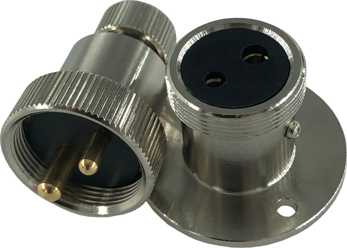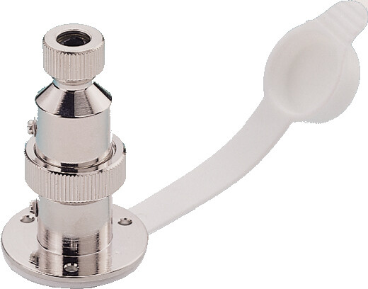 Forkrommet dekkskontakt med lokk. Kontakten kan brukes til å føre strøm eller signal gjennom overbygget på båten.