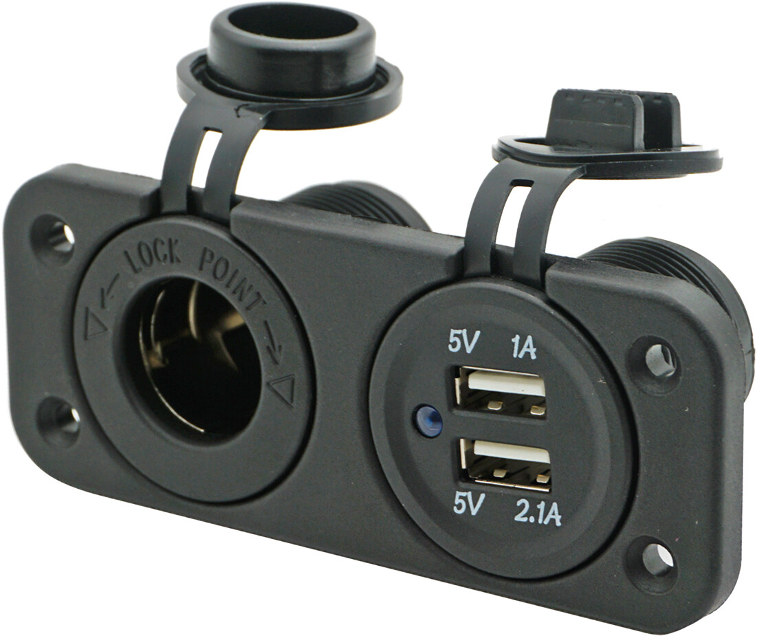 Kombinert, dobbel USB ladekontakt, og standard 12-volts strømuttak. Kontakten er laget for innfelling, som gir et pent og ryddig uttrykk. Tilkobling til strøm gjøres med vanlige kabelsko på baksiden.