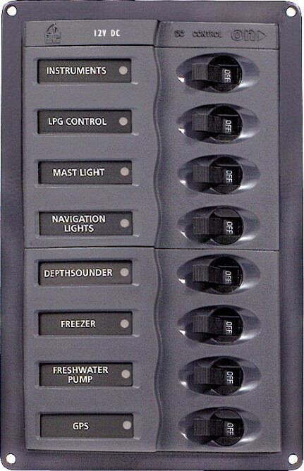 12V panel med 8 brytere/sikringer. Labelsett medfølger. Grønn LED bak label, rød LED indikerer PÅ. Pulverlakkert aluramme.