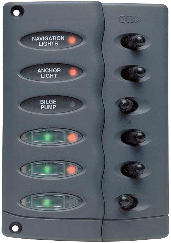 Sprutsikkert bryterpanel med vippebrytere. Meget høy kvalitet fra BEP. Utstyrt med seks automatiske termosikringer på 9A. Hvis sikringen skulle løse ut, slå av bryteren i ti sekunder og kursen er aktiv igjen. 12/24V. IP=65. 6 brytere.