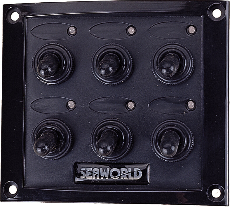 Sprutsikkert bryterpanel med seks vanntette brytere. Sikringer på baksiden av panelet. 12V.