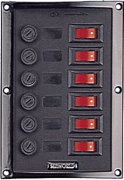 Seks belyste brytere med sikringer. Bryterne er plassert vertikalt. 12 V