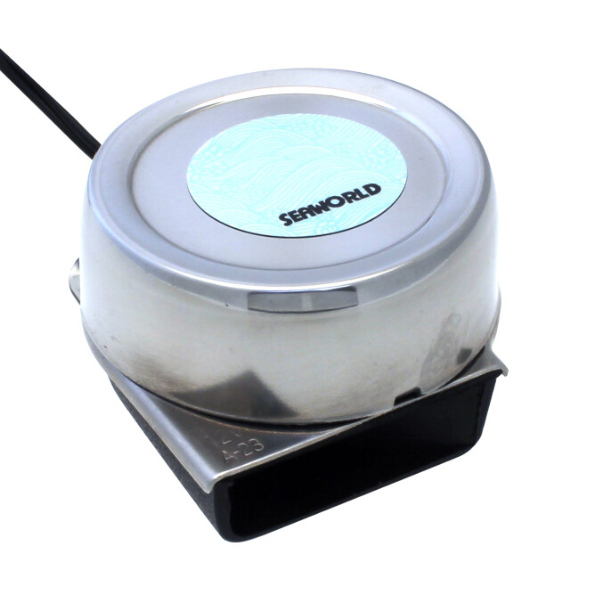 Kraftig membranhorn i blankpolert stål, med bunn i sort plast. Hornet har en mørk tone som bærer godt.