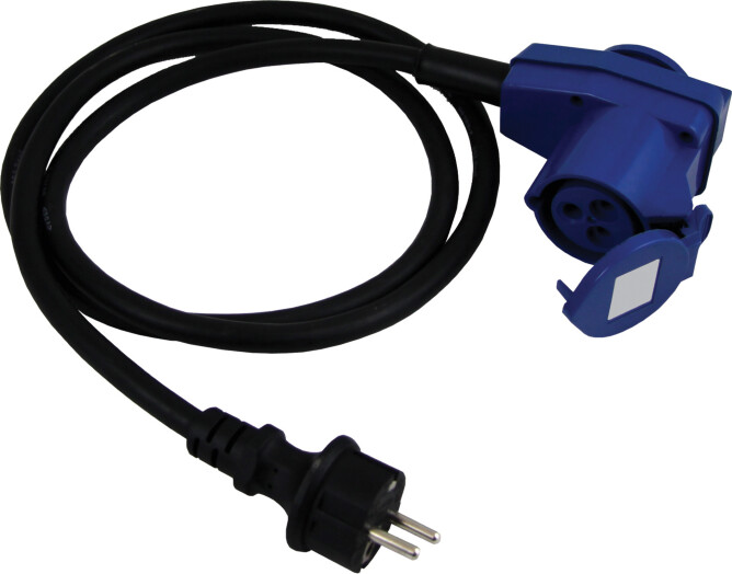 Landstrømkabel 3 x 2,5 mm2. Schuko han - vinklet CEE hun + Schuko hun på baksiden.