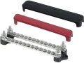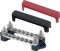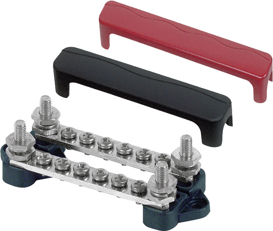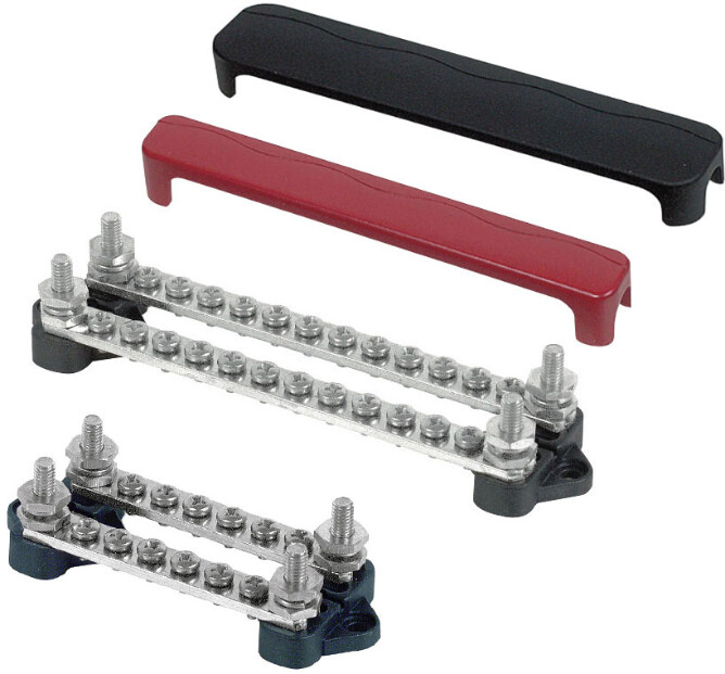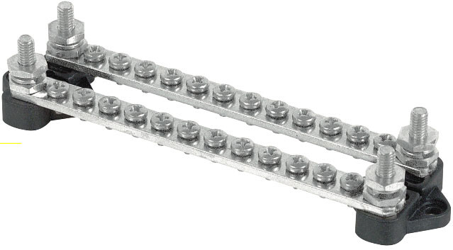 Doble koblingsskinner fra BEP. To separate skinner gir mulighet for forskjellig polaritet på de to skinnene. Skinnene er laget i fortinnet messing med skruer i rustfritt stål, og sokler i plast som tåler høy temperatur. Maksimal belastning er 100 A.