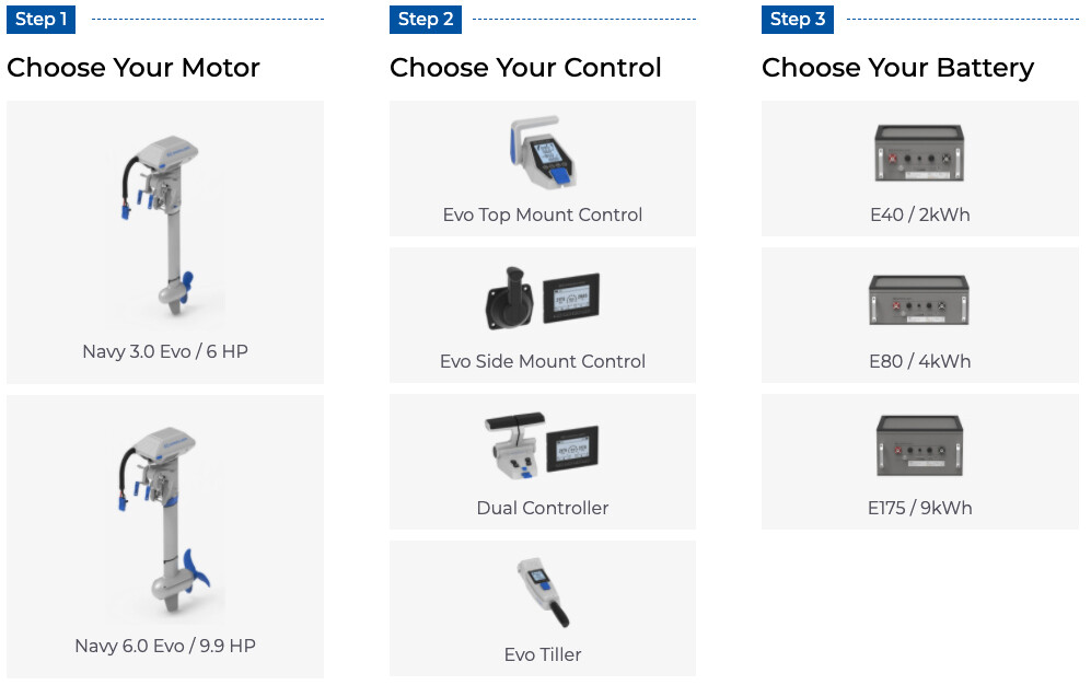 Navy-serien gir deg store valgmuligheter. Styringsenhet og batteri selges separat, slik at du kan sette sammen den perfekte løsningen til ditt behov. Du kan velge mellom forskjellige styringsenheter – alt fra klassisk rorkult, til konsollbaserte varianter. Du kan også velge mellom tre forskjellige batteristørrelser blant originalbatteriene. Selv om det anbefales å bruke ePropulsions originale 48V batterier, vil et riktig spesifisert batteri fra en tredjepartsleverandør også fungere.
