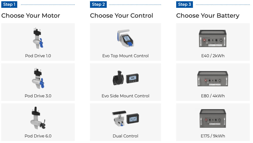 Pod-serien gir deg store valgmuligheter. Styringsenhet og batteri selges separat, slik at du kan sette sammen den perfekte løsningen til ditt behov. Du kan velge mellom tre forskjellige styringsenheter, og tre forskjellige batteristørrelser. Til Pod Drive 3.0 Evo kan du bruke ePropulsion E60 eller større batteri. Du kan også bruke to parallellkoble E40 batterier. Selv om det anbefales å bruke ePropulsions originale 48V batterier, vil et riktig spesifisert batteri fra en tredjepartsleverandør også fungere.