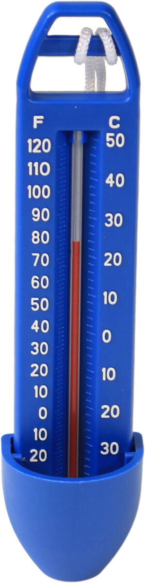 Kompakt badetermometer som flyter stående i vannet. Det leveres med snor til innfesting i badestige.