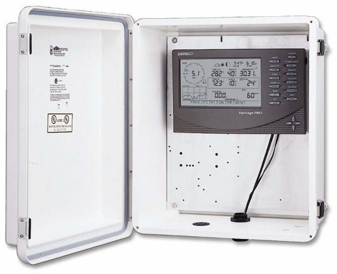 Stort skap for montering av værstasjon utendørs. Rommer displayet til Vantage Pro2, og har fortsatt plass til andre elementer. Værbestandig. Leveres med kabel for jording.