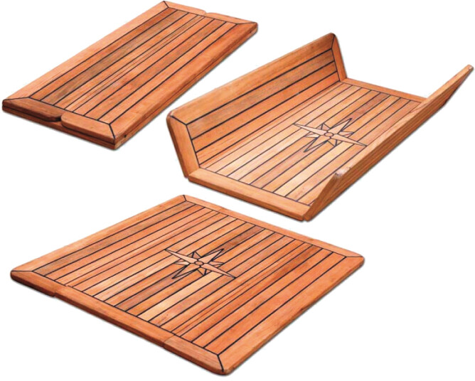Sammenleggbart firkantet teakbord med dekorativ stjerne i senter. Natet med Sikaflex 290DC. Kjerne av plywood som er forseglet to ganger med epoxy. Rundt bordet er det en 45 mm bred ramme i teak. Teakstavene er 31 mm brede og 16 mm tykke. Bordet kan brettes sammen.
