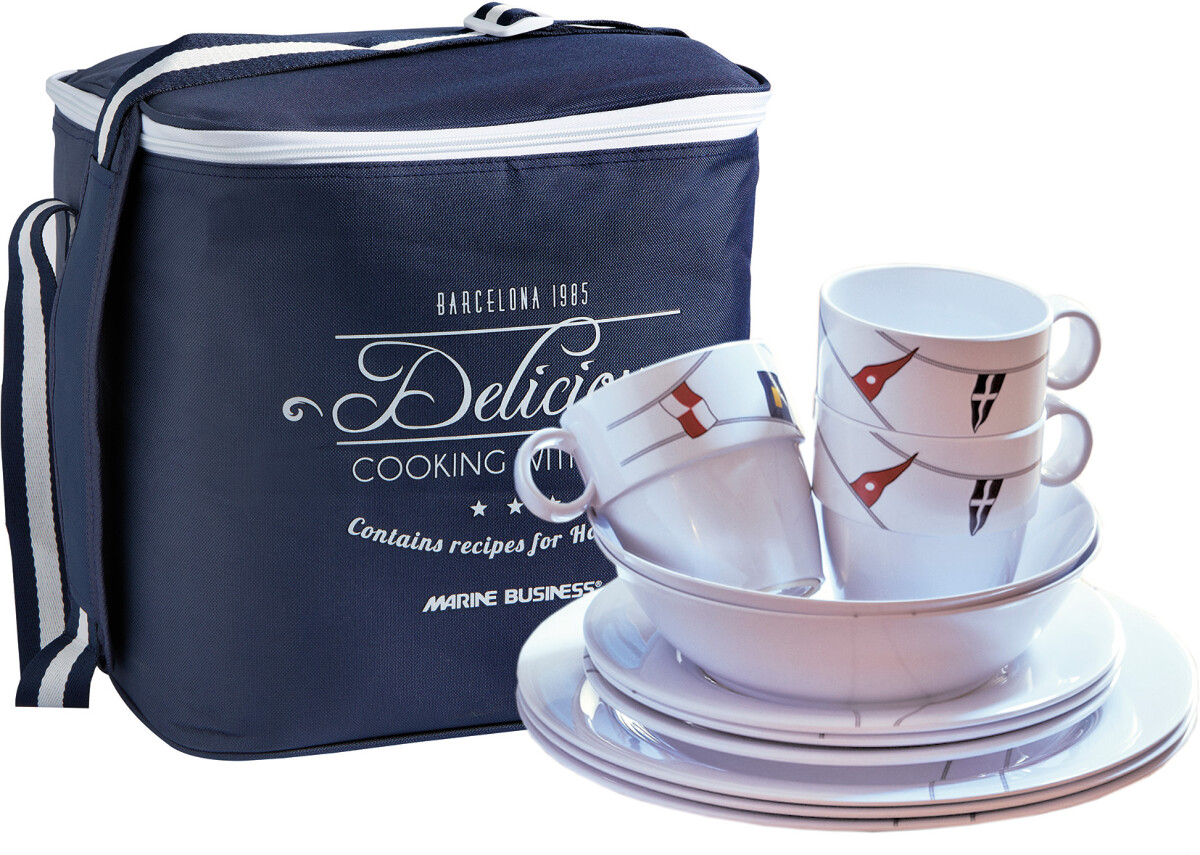Lekkert servise bestående av 4 kopper, 4 dype tallerkener, 4 frokosttallerkener, 4 middagstallerkener, samt en prakstisk bag for transport og oppbevaring. Alt med et pent og maritimt design. Gummiring under tallerknene og koppene gjør dem sklisikre, og ekstra praktiske til bruk i båt. De gjør seg også godt på hyttekjøkkenet, eller i sjøbua.