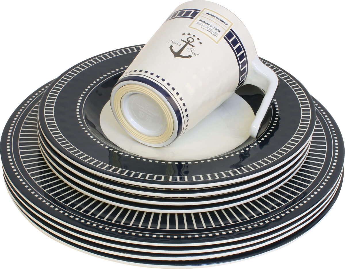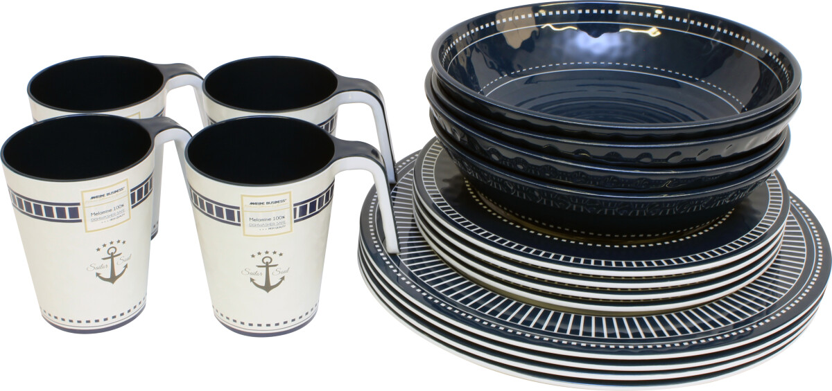 Bruddsikkert servise "Sailor Soul" i melamin og glass i høy kvalitet for fire personer, med et diskret preg og et eksklusivt nautisk design - elegant med karakter. Består av 16 deler + kurv.Inneholder: