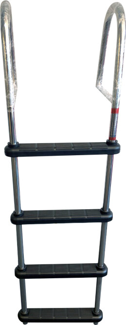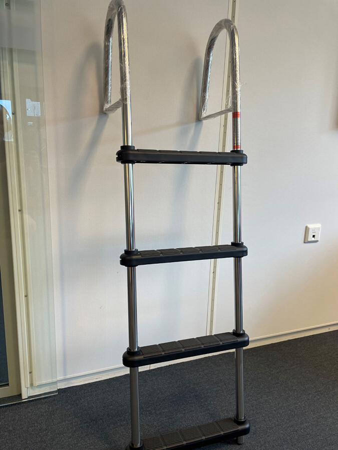 Bryggetrapp i syrefast stål med 4 sorte plasttrinn. Trappen festes med 4 skruer og kan demonteres.- Bredde: 34 cm
