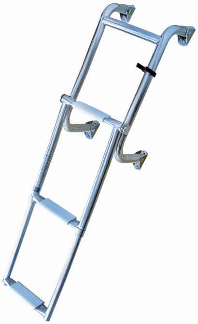 Foldbar badestige i syrefast med justerbare fester. Kan monteres enkelt på de fleste akterspeil pga justerbare festepunkter.- Bredde: 21 cm