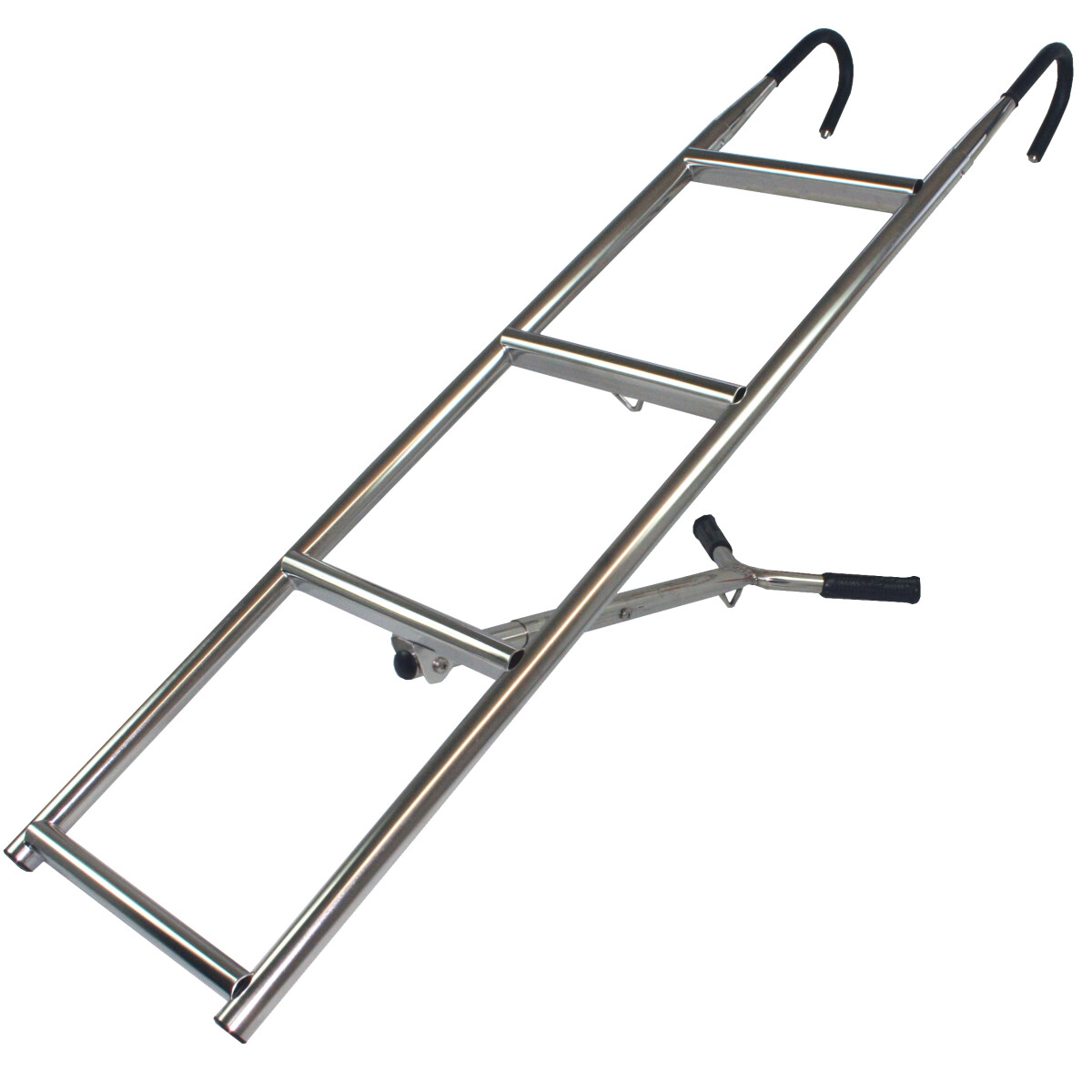 Utfellbar baugstige i syrefast stål. Ikke for fastmontering, hektes over rekken ved bruk.Rørdiameter: 9/19/25 mm (3 trinn) og 22/25/25 mm (4 og 5 trinn).