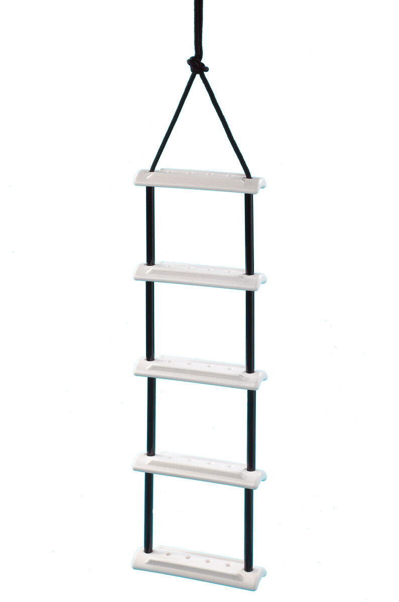 Nødstige med 5 trinn. Tar lite plass sammenslått. Solide plasttrinn med ruglete overflate for bedre grep. Solid tau (hvit) med løkke for hurtig montering og bruk.- Totallengde: 158 cm