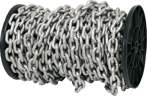Kortlenket, kalibrert kjetting i galvanisert stål. DIN 766. Leveres på spole.