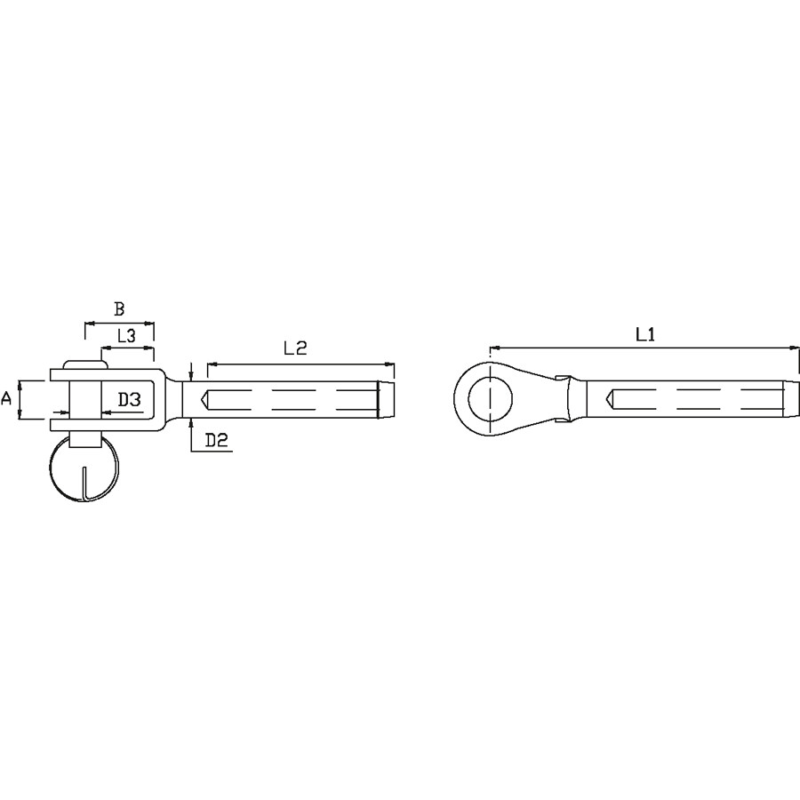 Blue Wave gaffelterminaler i valset, syrefast stål. Alle terminaler har inngravert wirestørrelse, Blue Wave logo, samt avmerking av hvor dypt wiren stikker i terminalen.