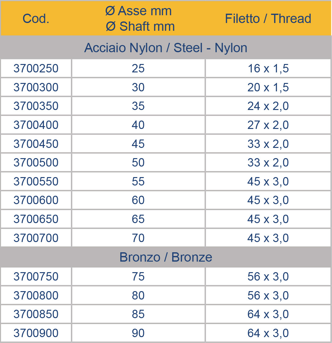 Låsemutteren er laget av stål og nylon fra 25 til 70 mm (Ø) og i bronse fra 75 til 90 mm (Ø). Den brukes på flenssiden.Se tilhørende fil under eller i bildegalleriet for målskisser med komplette mål.