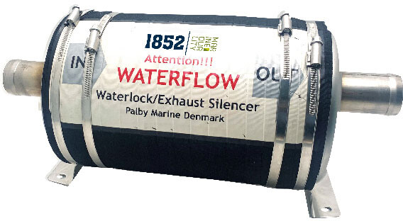 Effektiv vannkjølt lyddemper type A. Systemet kan brukes både på seil- og motorbåter. Lydpotten/vannlåsen er konstruert med 2 rustfrie stålender montert med en gummibelg. Fylt med vann gir den enestående lyddemping, og et minimum av motstand. Potten må monteres i båtens lengderetning.