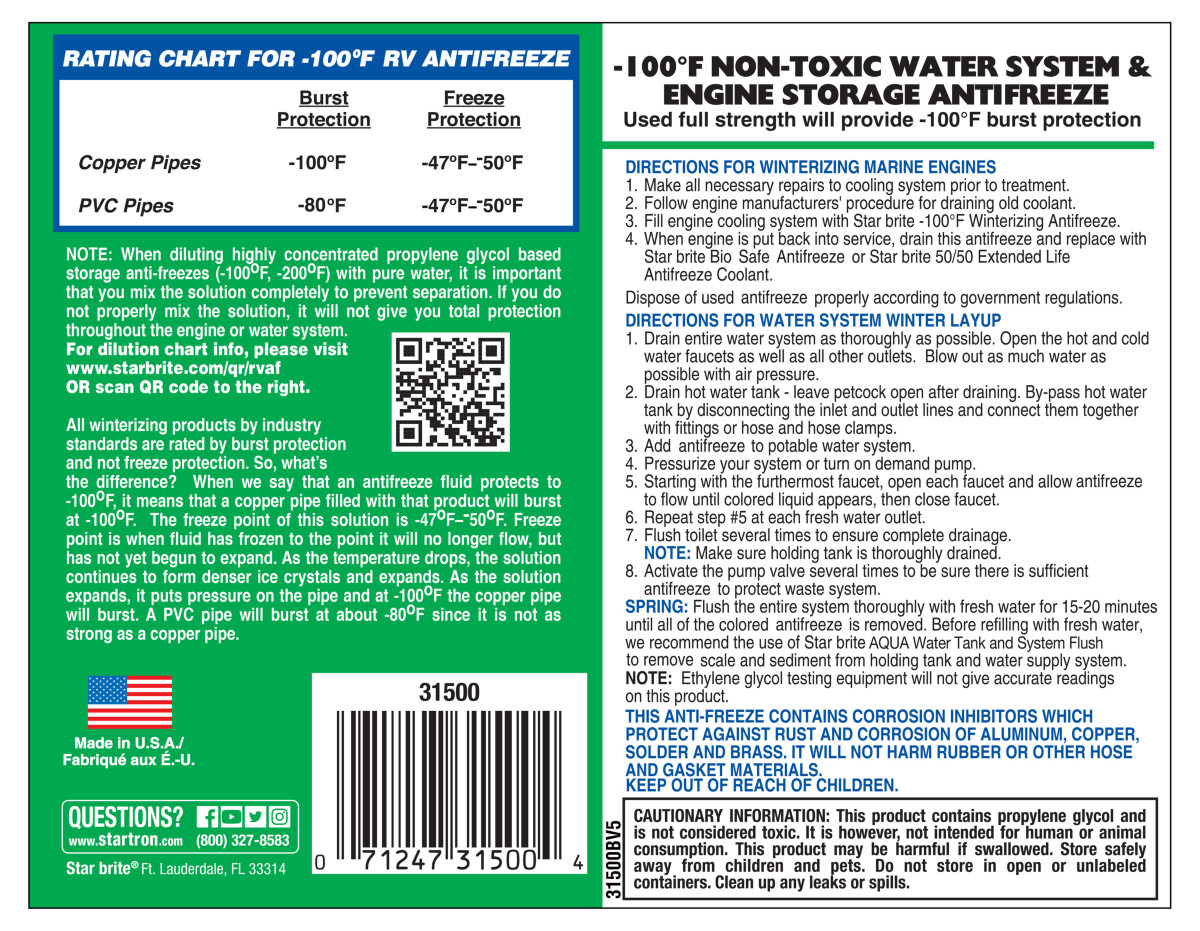 Star brite® -100°F (-73°C) giftfri frostvæske gir svært god kulde- og korrosjonsbeskyttelse for drikkevannssystemer og motorer. Dens førsteklasses tilsetninger forhindrer korrosjon av aluminium, kobber, messing og tinn, men vil ikke skade gummi, pakninger eller slanger. Den blågrønne fargen gir utmerket synlighet.
