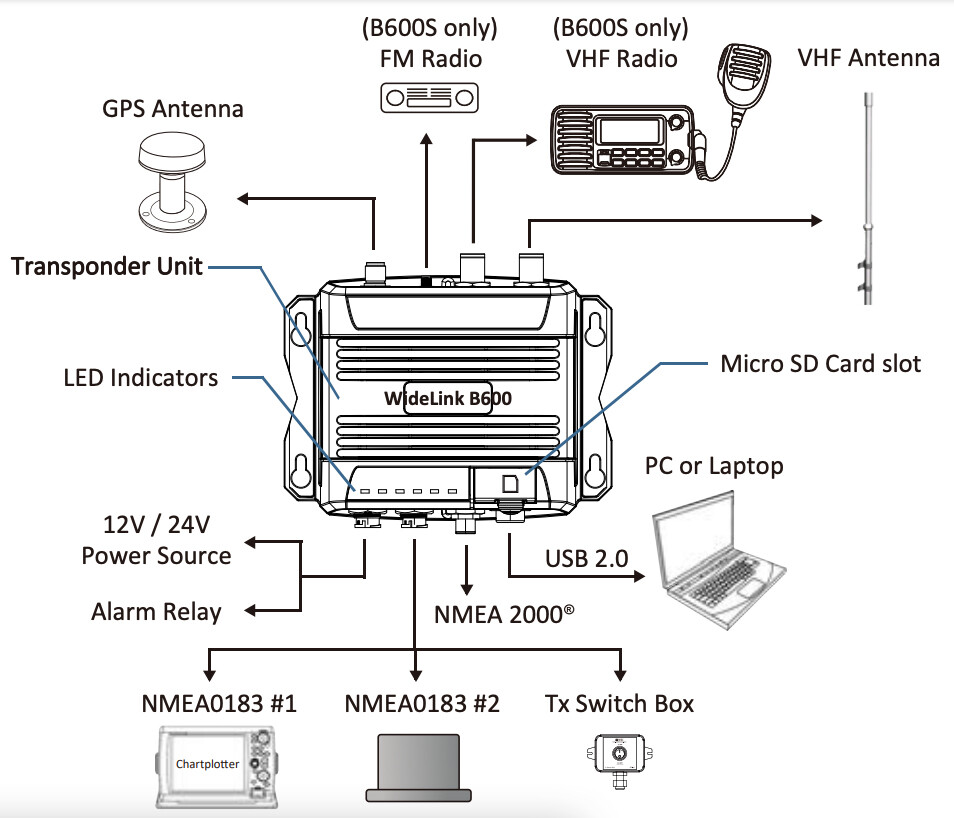 AMEC Widelink B600S er en kraftfull og avansert AIS med innebygget antennesplitter. Med antennesplitter kan du bruke den samme VHF-antennen til både AIS-en og til VHF-enheten. Du kobler da VHF-en til AIS-en.