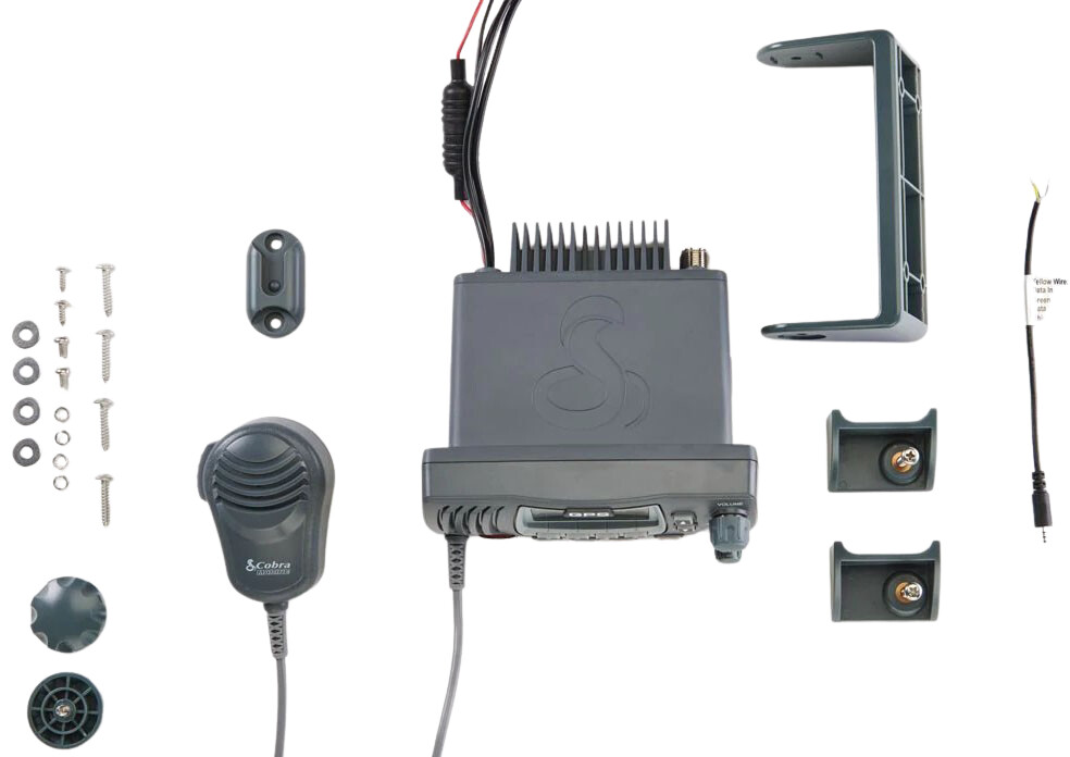 - I pakken: VHF med mikrofon og strømkabler, utstyr for innfelling, brakett for utenpåliggende montering, NMEA0183-kabel, bruksanvisning med utskjæringsmal.