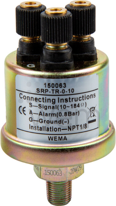 0-10 bars oljetrykksgiver med tilkobling for både signal, jord og alarm. Den passer til de fleste motorer uten jording i motorblokken. Den har alarm ved 0,8 bar (+/- 0,2 bar)