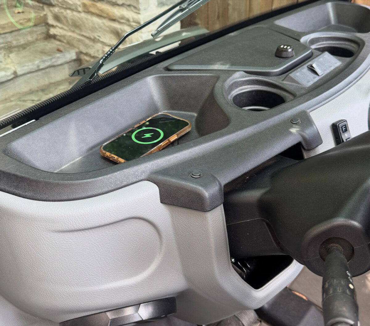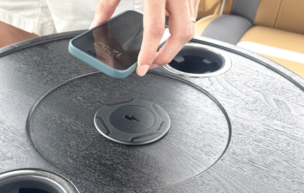 Trådløs mobillader for innbygging i båt, ATV, traktor og lignende. Platen kan monteres både i dashbord og i innredning.