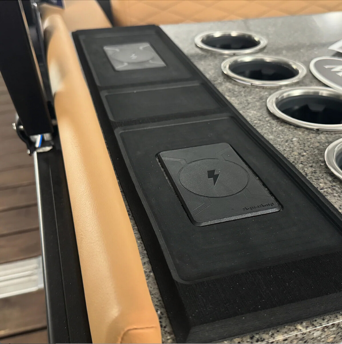 AquaAmp 200 er en rektangulær ladeplate for trådløs lading av mobiltelefon. Den er laget for innfelling, og kan lade alle telefoner som er kompatible med trådløs Qi-/Qi2-lading. Overflaten er gummiert, som gjør at telefonen ligger stabilt.Laderen er enkel å montere. Det er bare å borre et 62 mm hull der den skal stå, plassere laderen over hullet, og koble til 12V strøm. Ladeplaten kommer ferdig med 3M dobbeltsidig tape. Ønsker du en ekstra sterk montering, kan du kjøpe med låsering (prod.nr. 1011364). Det er også mulig å koble til en statuslampe, som viser om telefonen lader eller ikke (prod.nr. 1011363).