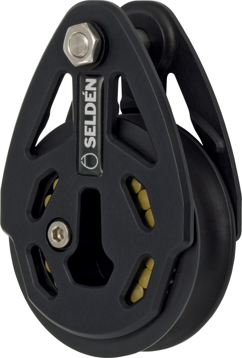 Seldén Roller Ball Bearing fallblokk har blokksider og skiver i maskinbearbeidet sorteloksert aluminium, og rullelager i Torlon. Alle rustfrie komponenter er isolert fra aluminium for å hindre korrosjon. Sidelager har delerinkuler.