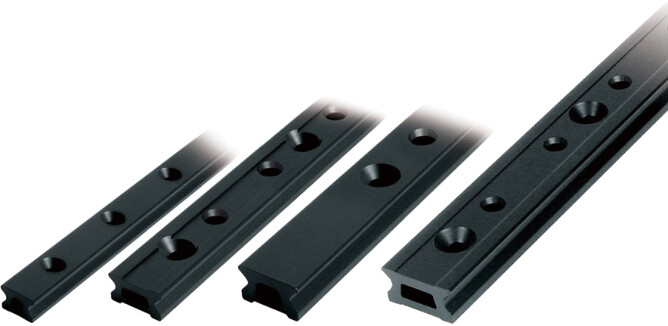 Skinner til Ronstan vogner. Passer både kulelagrede vogner og vogner med Slide Rods. Std. hullavstand 100 mm. med stopperhull hver 50 mm. unntatt serie 14 som har skruehull hver 50 mm og ingen stopperhull. Passer også sammen med Ronstan Batten Systems for track & car. Standard farge er sort.