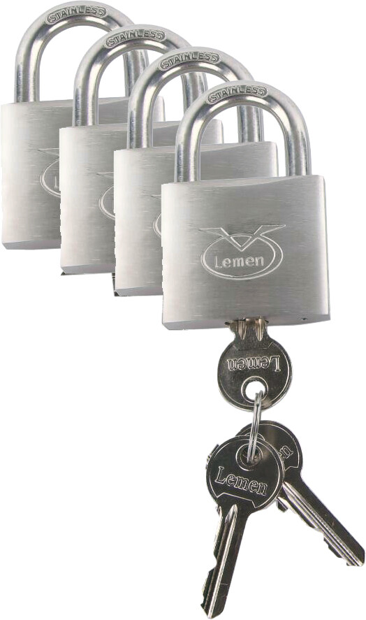Sett med 4 stk 30 mm marinehengelåser i rustfritt stål med master key. Det leveres med tre nøkler til hver lås pluss et sett med 3 stk masterkeys som passer til alle fire låsene.